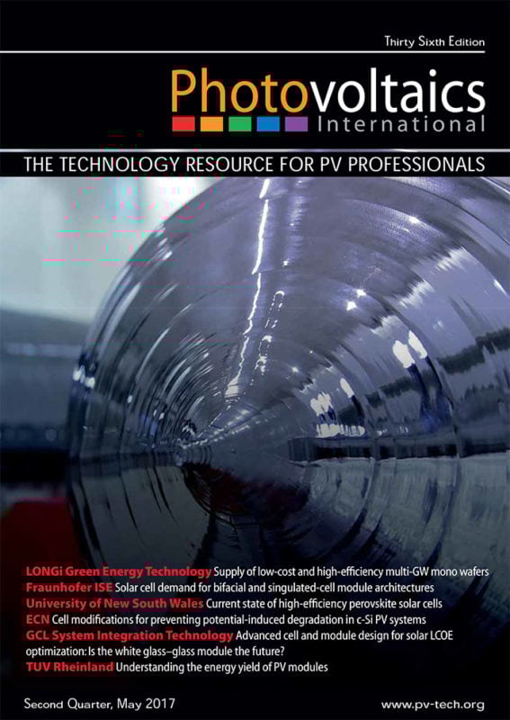 In this issue of Photovoltaics International Fraunhofer ISE presents a concept for a bifacial, shingled cell technology that it claims tracks a cost-effective route to a 400W module using existing industrial-scale concepts. Also one trend now much more than a notion is the ongoing switch to monocrystalline cell technology. Meanwhile the University of New South Wales pulls together and critically assesses the raft of research on perovskite PV technology. Following the success of our PV CellTech conference, we’re also introducing our new PV ModuleTech event focusing on the technology that turns completed cells into supplied modules in the commercial market.