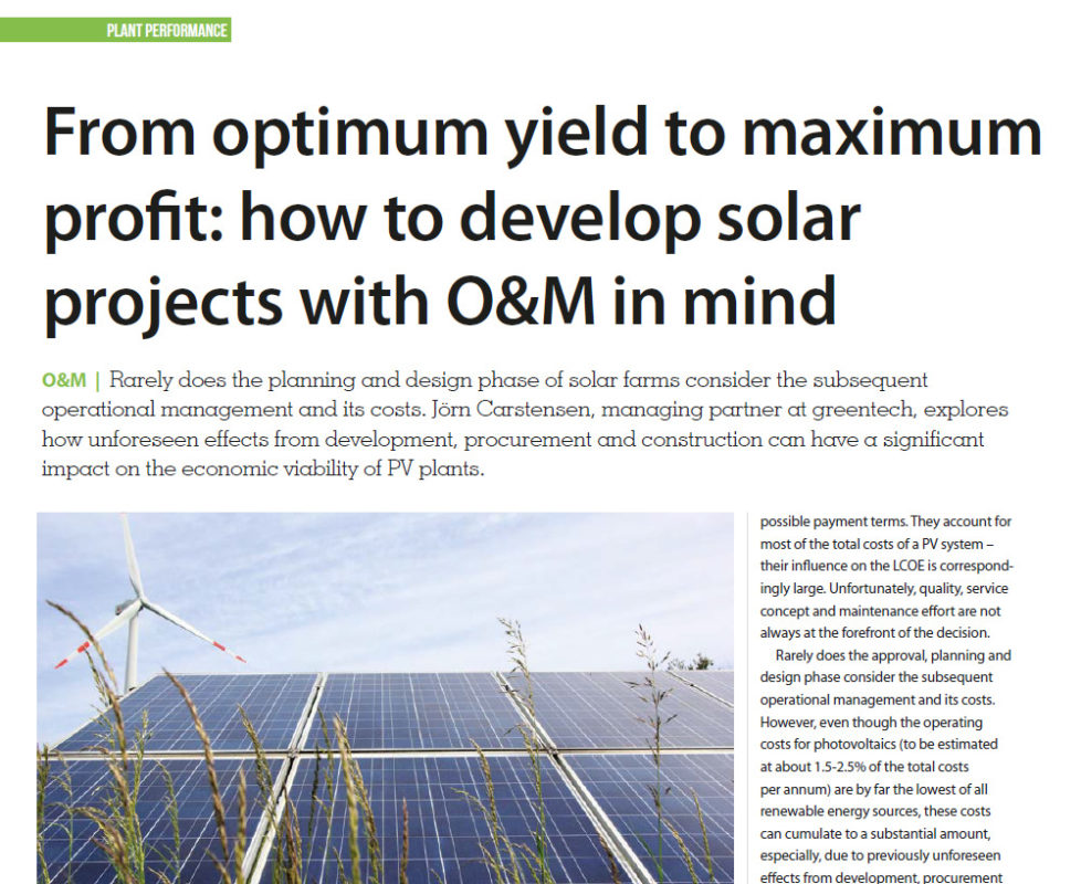 Rarely does the planning and design phase of solar farms consider the subsequent operational management and its costs. Jörn Carstensen, managing partner at greentech, explores how unforeseen effects from development, procurement and construction can have a significant impact on the economic viability of PV plants.