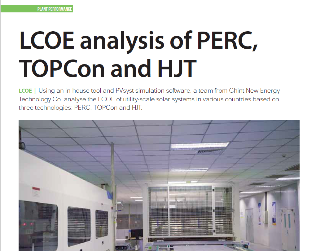Using an in-house tool and PVsyst simulation software, a team from Chint New Energy Technology Co. analyse the LCOE of utility-scale solar systems in various countries based on three technologies: PERC, TOPCon and HJT.