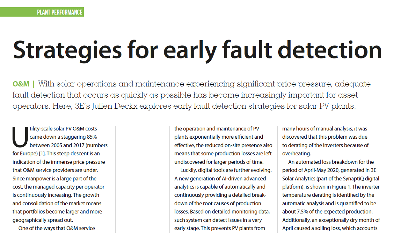 With solar operations and maintenance experiencing significant price pressure, adequate fault detection that occurs as quickly as possible has become increasingly important for asset operators. Here, 3E’s Julien Deckx explores early fault detection strategies for solar PV plants.