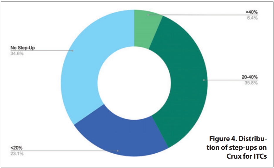 Projects may take on an equity investment from an unrelated third party before entering service and, in doing so, step up the project’s cost basis (and ITC value) to fair market value (FMV). Step-up in basis is relatively common in transfer deals. About 65% of ITCs on Crux have a step-up in basis. The majority of all ITC deals (59%) have a step-up under 40%, meaning that the FMV of the investor partner’s project investment increases the cost basis of the ITC by less than 40%.